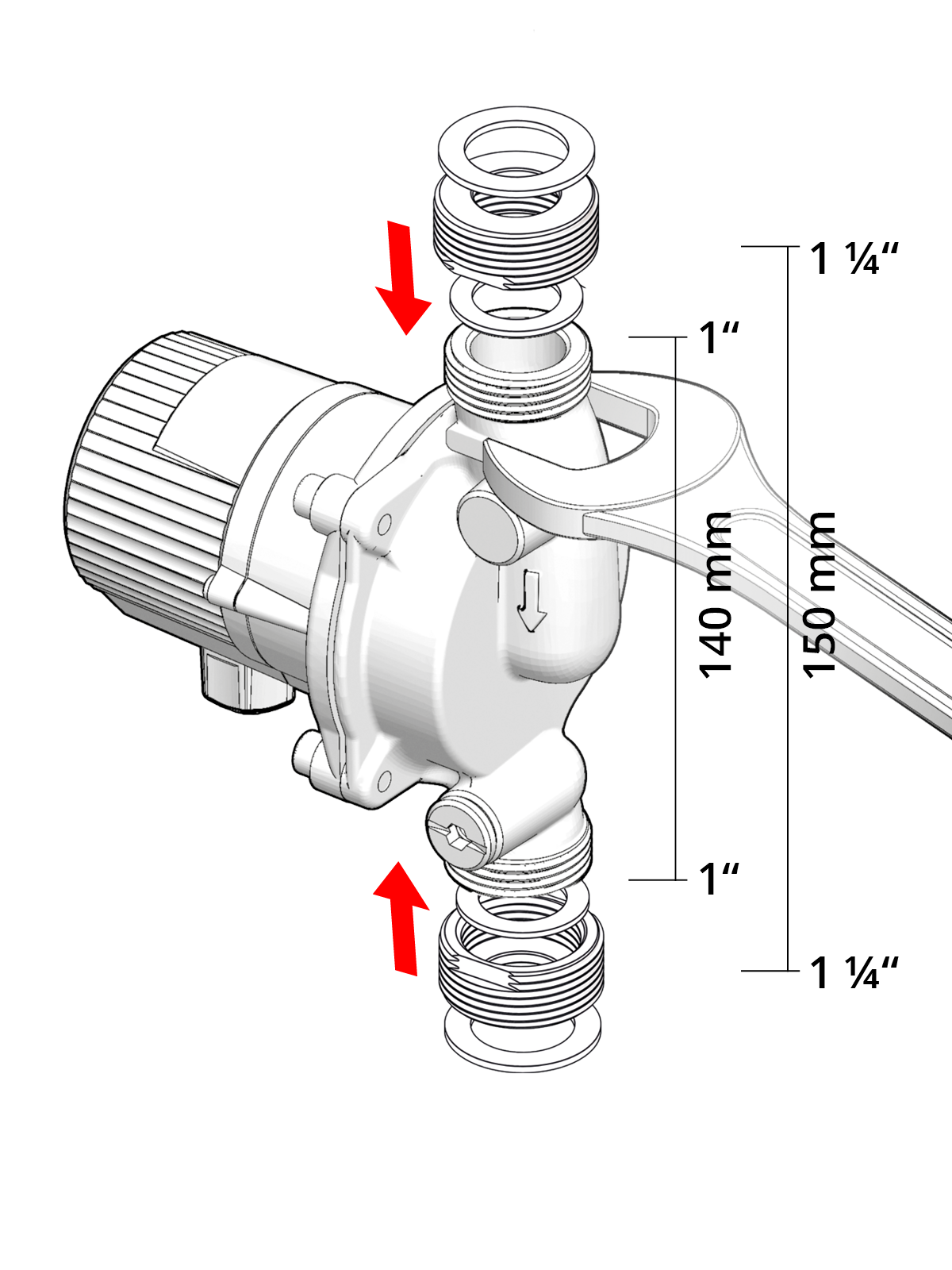 Das Adapterset auf das 1" Gewinde aufschrauben und mit 15 Nm festziehen. Flachdichtung ist bereits im Adapterset vormontiert.